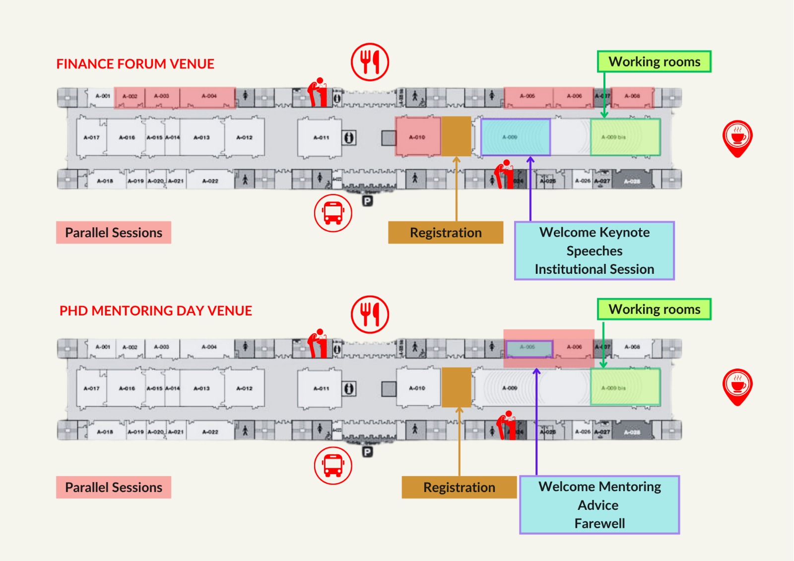 The map below shows the layout of the classrooms and main areas used during the conference, including session rooms, the registration desk, and directions to the Cafeteria and Dining Hall.